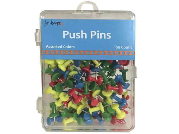 Assorted Color Push Pins - 100 Count in Plastic Holder |